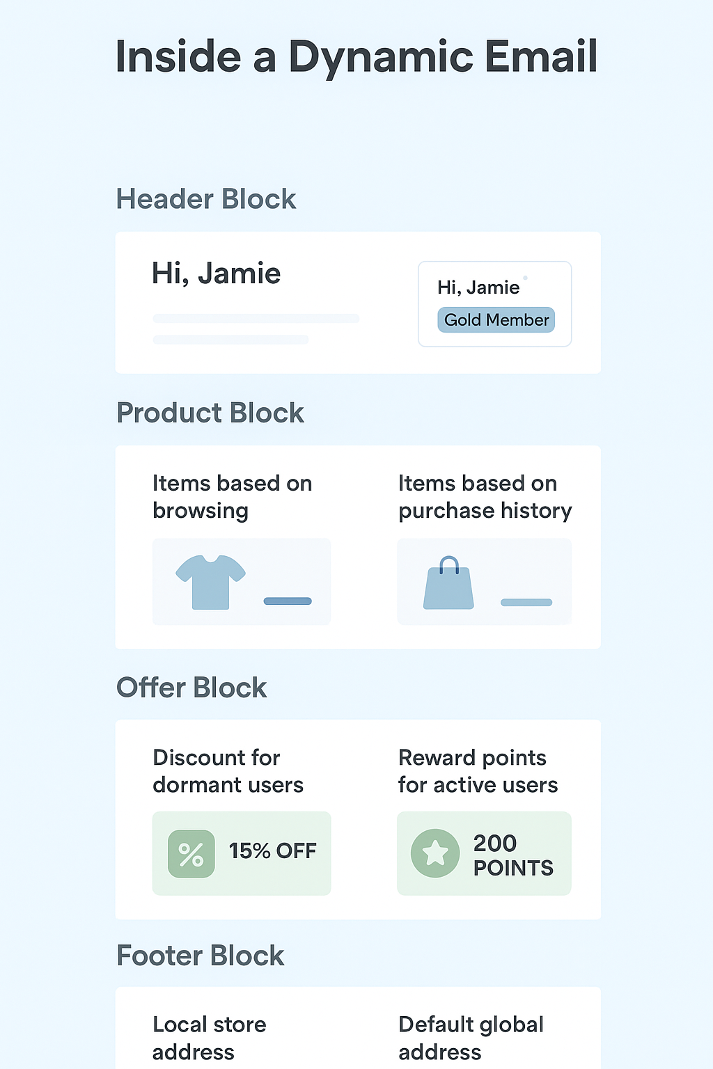 Dynamic blocks allow each section to change according to user conditions. For instance, a customer who viewed winter jackets receives a product showcase that focuses on outdoor wear, while another customer who browsed accessories sees a different set of choices.